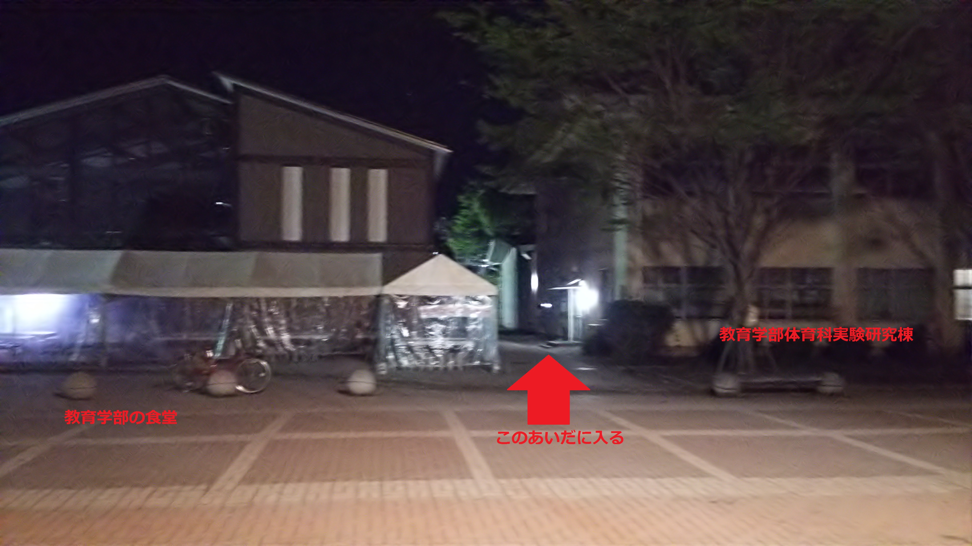 教科書販売所でもある教育学部の食堂と教育学部体育課実験研究棟のあいだの通路の先にあります。